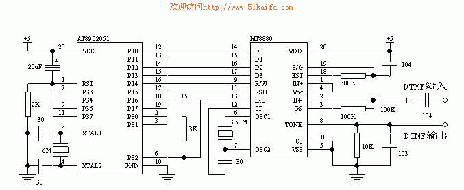 加拿大MITEL公司生产的MT8880是一种带有CPU接口的DTMF(双音多频)发送/接收芯片,其可与6800系列微处理器或单片机直接接口。然而,对于想使用MT8880芯片的51系列单片机用户而言,关注的是51系列单片机如何与MT8880接口的问题。本文将以具有51内核的 AT89C2051(简称2051)单片机为例,介绍2051单片机与MT8880接口电路的设计,供有关用户参考。