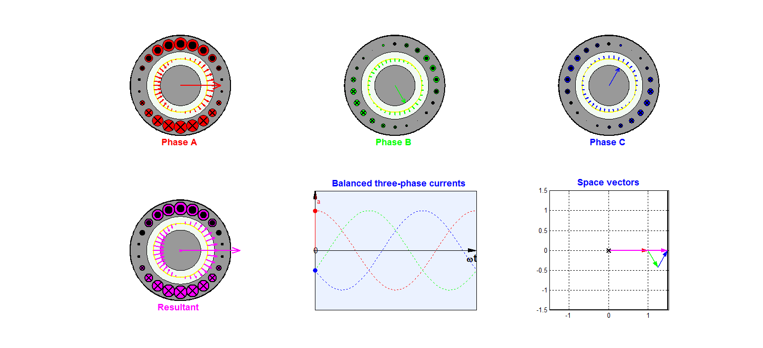 图一揭示了在空间成120度分布的3相固定绕组,分别通以相差120度相位角,幅值成正弦变化的电流,产生一个幅值固定的圆形旋转磁场的过程。