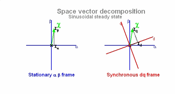 如果我们站在转子上看,也就是我们和转子一起旋转,在空间成90度分布的2相固定绕组通以直流电流也能产生一个圆形旋转磁场,这就是矢量控制中的Park变换,即2相旋转到2相静止的变换,也就是图二右半部分所表示的。