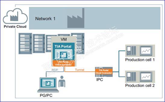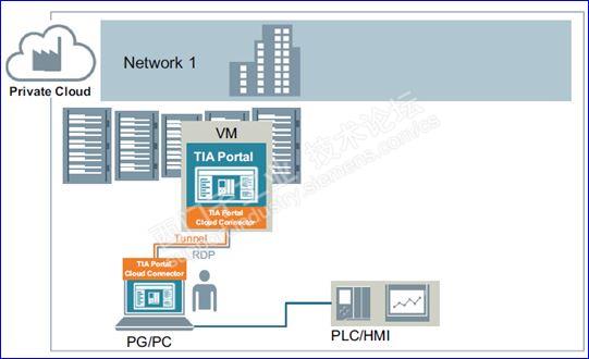 我们可以把博途V14安装到云服务器的虚拟机上,而要组态的PLC和HMI可以放在现场。通过一对云连接器把云端的博途和现场的计算机之间打个通道,然后工程师就可以用Windows自带的运程桌面连接远端的博途所在的虚拟机,进行PLC和HMI的组态,完后直接能向现场计算机连接的PLC和HMI下载程序了,下图一目了然: