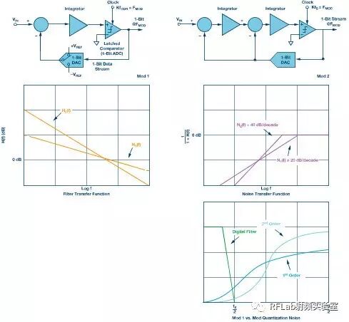 图6.Mod 1和Mod 2框图配置以及滤波器和噪声传递函数的比较图