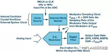 Σ-Δ型ADC使用内部或外部采样时钟。ADC的主时钟(MCLK)常常要先分频,再交由调制器使用;阅读ADC数据手册时应注意这点,并了解调制器频率。传送到调制器的时钟设置采样频率FMOD。调制器以该速率将数据输出到数字滤波器,进而数字滤波器(通常为低通,带抽取功能)以输出数据速率(ODR)提供数据。图3显示了这一过程