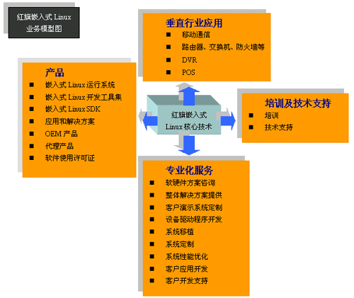 把先进的嵌入式技术带给用户是红旗的目标。基于这一目标,一方面红旗向用户提供成熟的技术、产品、解决方案和技术支持,帮助用户完成产品设计;另一方面,红旗结合用户需求,按照CMM项目管理标准,在最短的时间内为用户完成全部设计工作。现在,根据用户的需求特点,在红旗嵌入式Linux核心技术的支持下,红旗嵌入式Linux的业务模型囊括了产品、垂直行业应用解决方案、专业化服务、培训及技术支持四大领域。在每一个领域,红旗都向客户提供成熟的服务内容,从而保证客户能够获得红旗的完善支持。