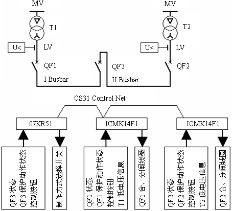若两进线断路器与母联断路器相隔较远,例如在同一排柜体两侧或在不同排,此时采用远程功能扩展模块ICMI14F1配合PLC主机07KR51较为方便。两进线回路使用ICMI14F1,而母联回路使用07KR51,系统间省却了互锁、联络、控制和信号等等接线,仅仅敷设一条双绞通信线即可。