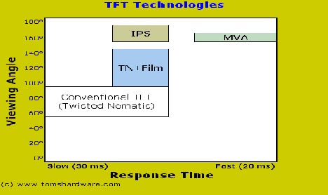 TN+视角扩大膜对响应时间并无太多的改善。之前已提过,这个技术较为便宜并且良率较高,仅能把视角提升到人眼可接受的程度。使用这个技术的显示器将会渐渐没落。