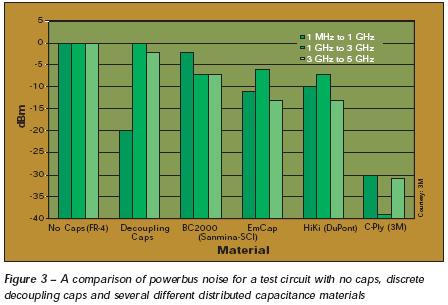 对一个测试电路分别在没有电容、分立的退耦电容和几种不同材料制成的分布式电容的情况下,对其电源总线噪声进行测试,其结果见图3。可以注意到,分立的电容在频率上升到5G时失去其作用,而嵌入式电容仍然起作用。