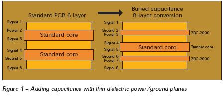 通常使用嵌入式电容的方法包括一种叫做分布式电容或平面电容的概念。在铜层的基础上压上非常薄的绝缘层。一般以电源层/地层的形式成对出现。非常薄的绝缘层使电源层与地层之间的距离非常小。这样的电容量也可以通过传统的金属化孔实现。图1表示了一个传统的电路板通过使用嵌入式电容技术重新设计的比较。基本上来说,这样的方法在电路板上建立了一个大的平行的板极电容。