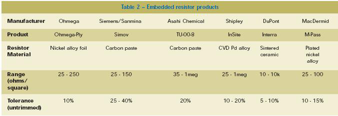 粘剂已经取得了很大的进步,但其公差仍然很大。还有更好的解决技术吗?一些新兴的材料和工艺已经处于不同的开发阶段(表2)。DuPont将印制在铜箔上的高温电阻粘剂烧结成各种电阻器。该层被反压于胶片之上形成FR4的板芯。感光性树脂被应用到铜箔上,经过曝光,显影以及蚀刻形成完全的瓷片电阻器电路。