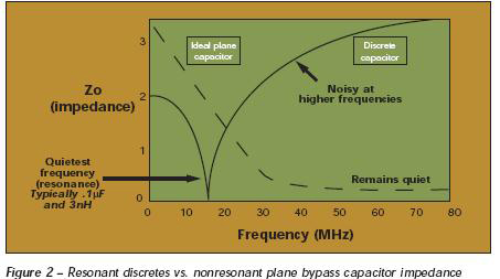 唯一的真正商用的嵌入式产品是BC 2000(Sanmina-SCI 公司)。其电容量很低,大约为0.5nF/in2,可以作为很好的滤波电容被应用。板极电容在高频情况下特别适用,因为在高频时,传统的分立电容的电感量将显著增加(见图2)。