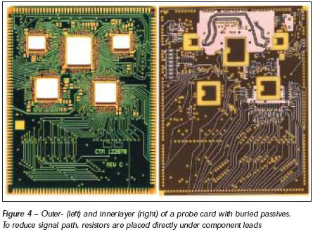 Ohmega-Ply的电阻范围只能在25~250ohm/square,但将其设计成蜿蜒样式(高长宽比)可获得更高的电阻值。该技术已经被应用于通讯设备中,例如卫星、基站、医疗电子设备、航空电子设备和电脑设备。和嵌入式电容一样,嵌入式电阻也可以节约空间、减少重量和尺寸。同时也可以提升电子性能。举例如图4,该探针卡有超过100个电阻,有6种不同电阻值。可以注意到这些电阻被直接放置在元件管脚的下方以减少信号至电阻的通路长度。图5显示了一个照相电路,其中的电阻形成了一个可变电阻器。值得注意的是每一个电阻的阻值是渐变的,其精度经激光校正可达+/-1%。