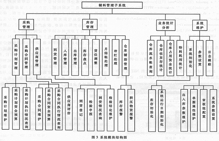 本系统由采购管理、库存管理、业务分析和系统维护四个主要模块组成。从计划管理→合同管理→到货管理→自左至右形成了一条清晰的数据流。系统的模块结构图如图3所示。