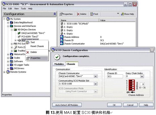 答:您依旧可依在MAX中通过选择NI-DAQmx Devices、右击SCXI机箱并选择Properties来设置SCXI模块属性。您可以看到每个安装在机箱中的模块并且您可以通过单击详细信息来设置每个模块的属性。