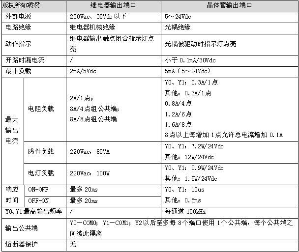 由于继电器与晶体管工作原理的不同,导致了两者的工作参数存在了较大的差异,下面以艾默生EC系列PLC相关数据为例进行比较说明(输出口主要规格参见表1)