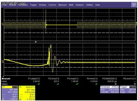 继电器控制接触器等感性负载的开合瞬间,由于电感具有电流具有不可突变的特点,因此根据U=L*(dI/dt),将产生一个瞬间的尖峰电压在继电器的两个触点之间,该电压幅值超过继电器的触点耐压的降额;继电器采用的电磁式继电器,触点间的耐受电压是1000V(1min),若触点间的电压长期的工作在1000V左右的话,容易造成触点金属迁移和氧化,出现接触电阻变大、接触不良和触点粘接的现象。而且动作频率越快现象越严重。瞬间高压如下图2所示,持续的时间在1ms以内,幅值为1KV以上。晶体管输出为感性负载时也同样存在这个问题,该瞬时高压可能导致晶体管的损坏。