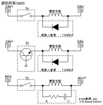 继电器型输出驱动电流大,响应慢,有机械寿命,适用于驱动中间继电器、接触器的线圈、指示灯等动作频率不高的场合。晶体管输出驱动电流小,频率高,寿命长,适用于控制伺服控制器、固态继电器等要求频率高、寿命长的应用场合。在高频应用场合,如果同时需要驱动大负载,可以加其他设备(如中间继电器,固态继电器等)方式驱动。5. 驱动感性负载的影响