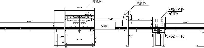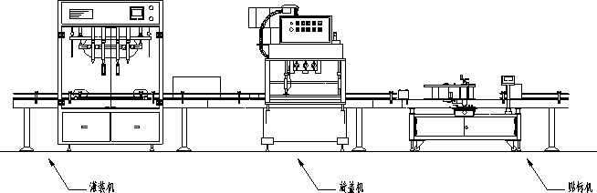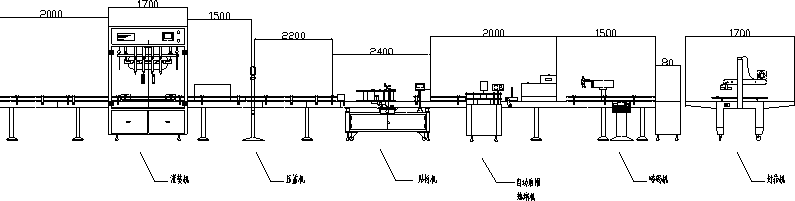 方案设计一:灌装机+压盖机+贴标机+自动胶帽热缩机+喷码机+封箱机